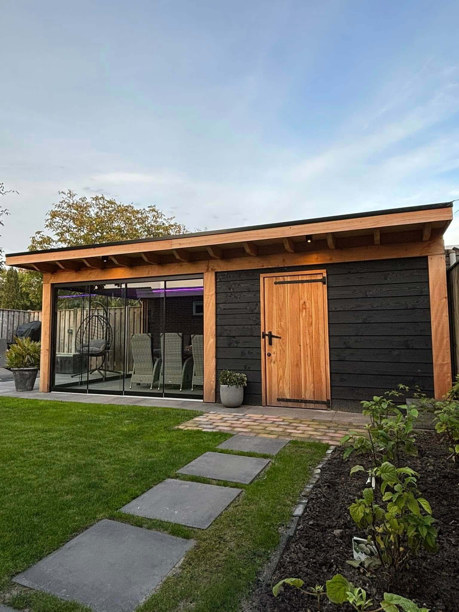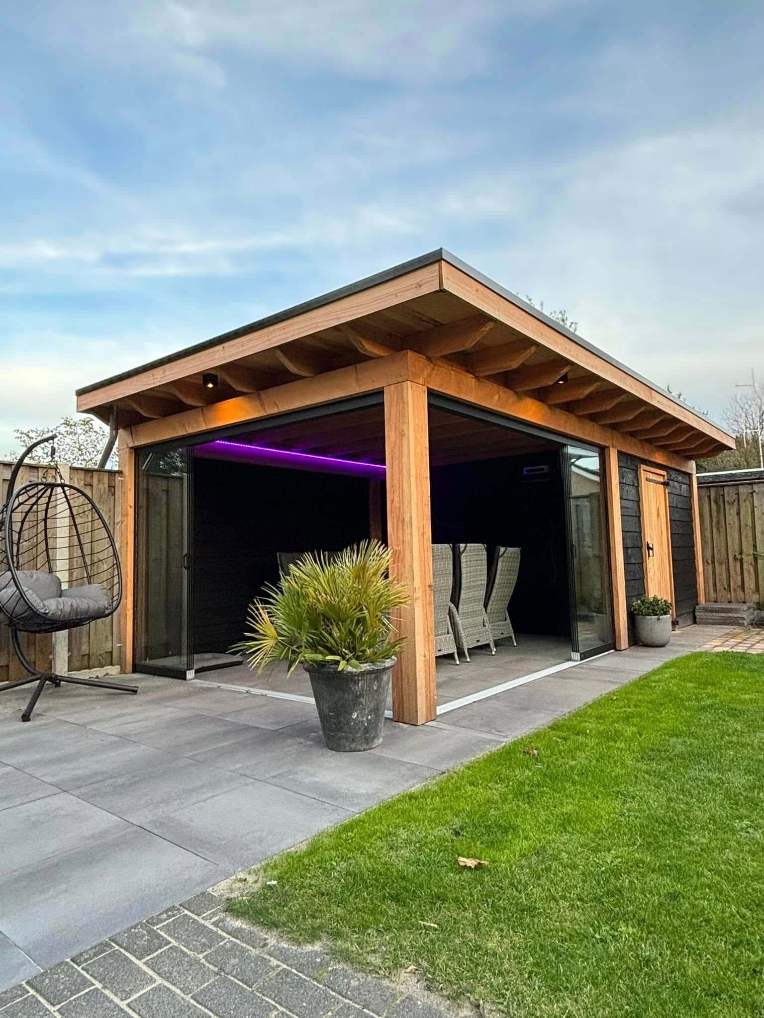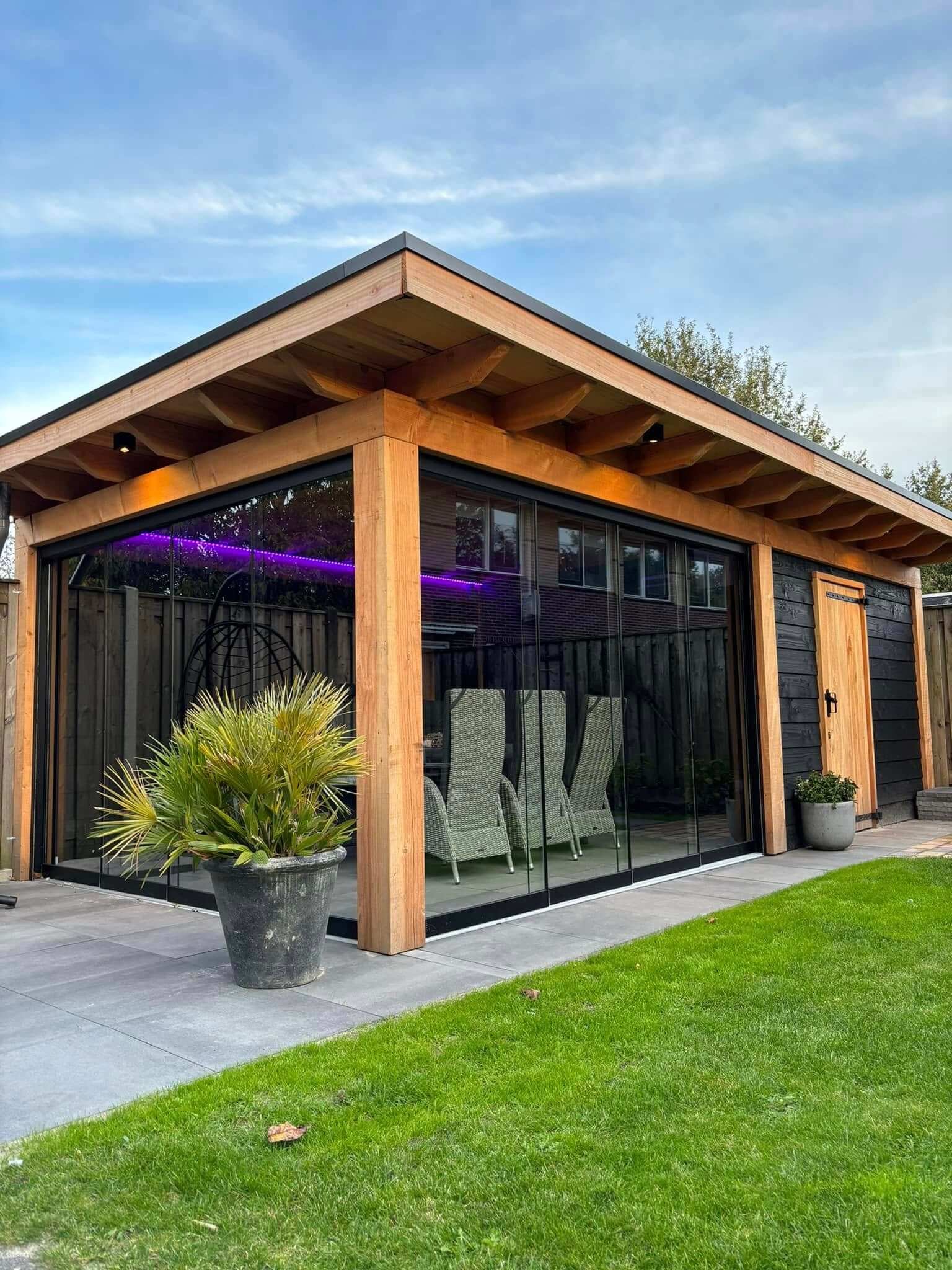 Deze prachtige Douglas overkapping hebben wij voorzien van glazen schuifwanden als stijlvolle afronding van het geheel. Er is gekozen voor zwarte aluminium profielen in RAL 9005, een combinatie die schitterend contrasteert met het warme Douglas hout en zorgt voor een moderne, luxe uitstraling.