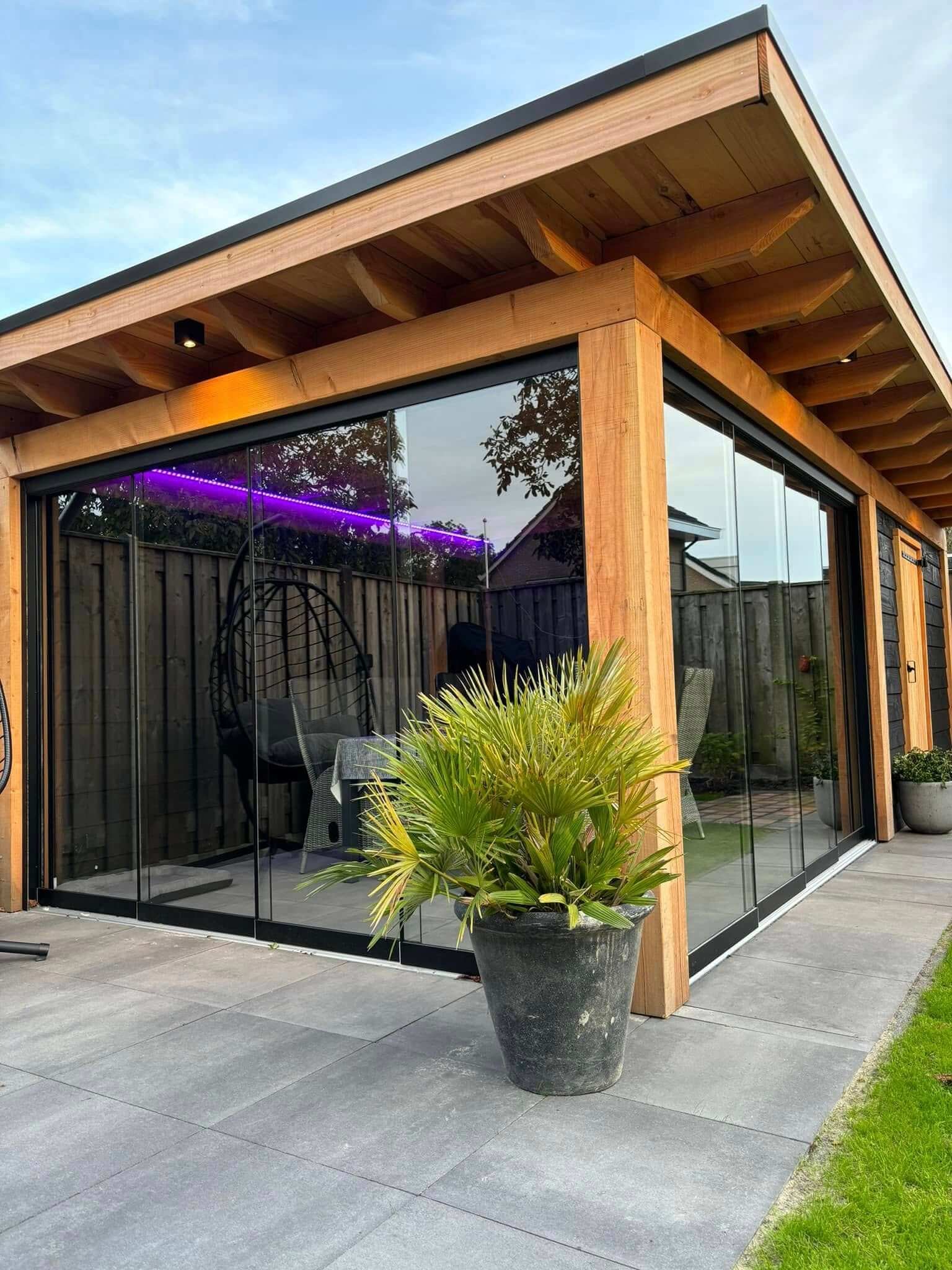 Glazen schuifwanden zijn niet alleen een esthetische upgrade, maar verhogen ook direct het comfort. Ze beschermen tegen wind en regen, terwijl het open gevoel behouden blijft, zodat u elk seizoen optimaal kunt genieten van uw buitenruimte.
