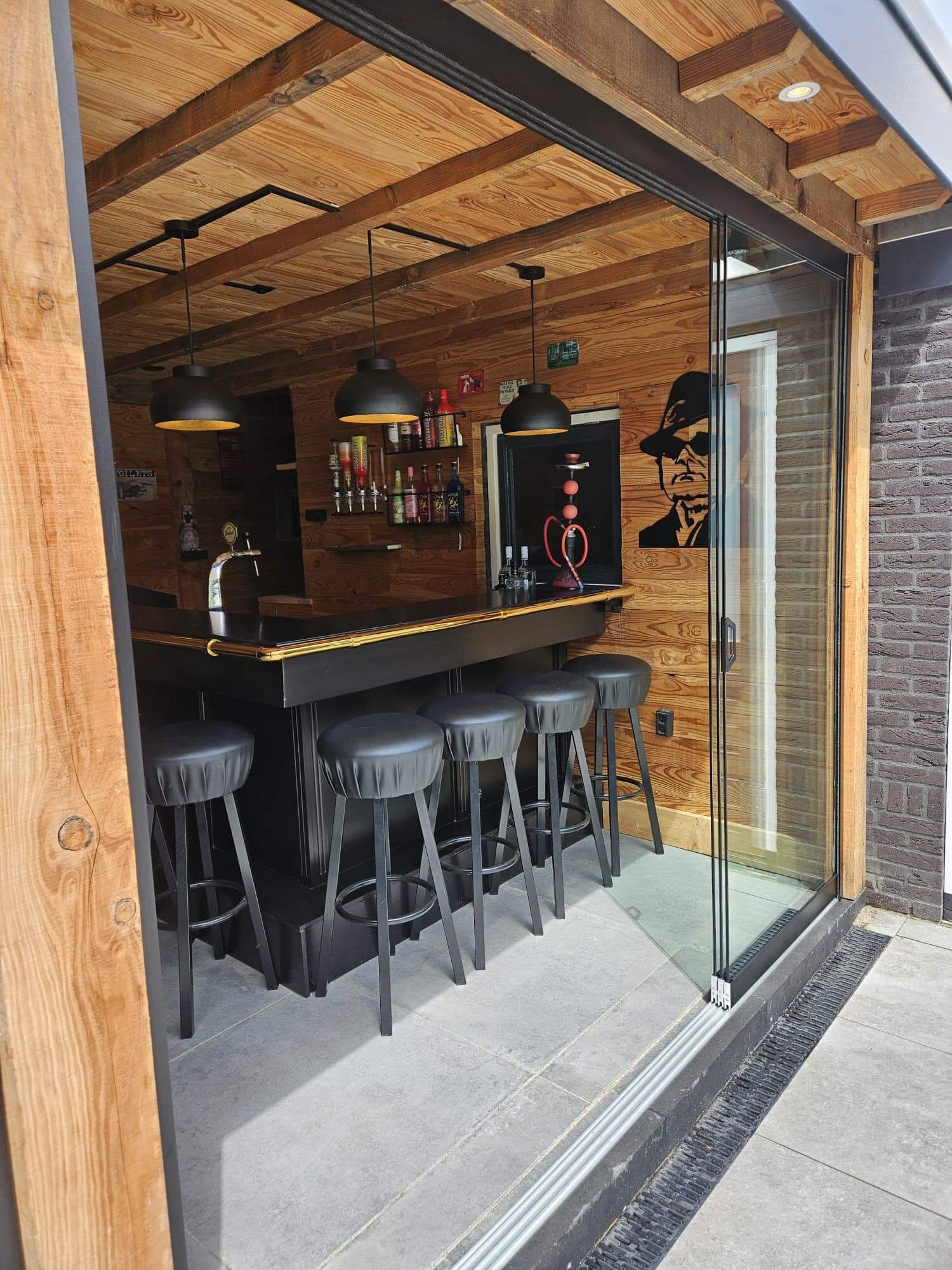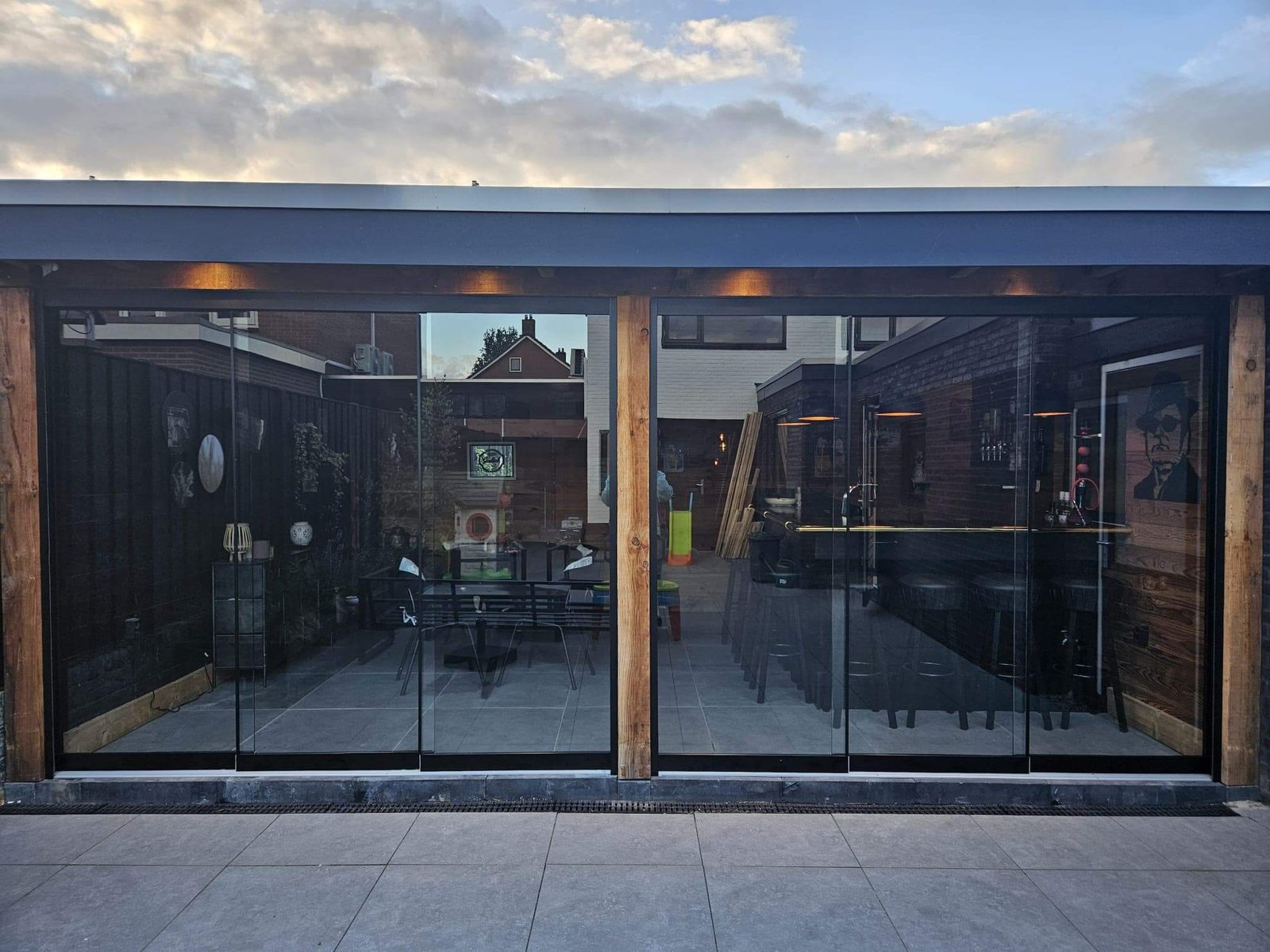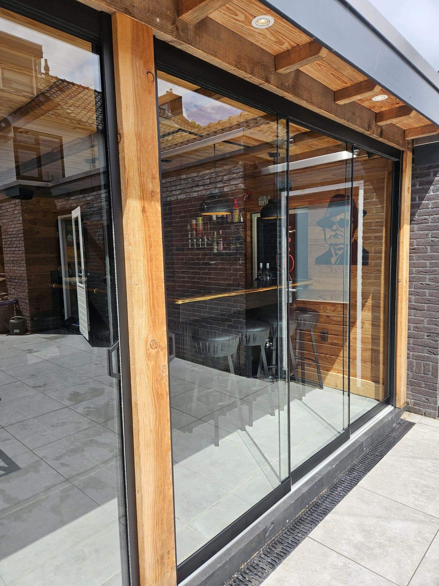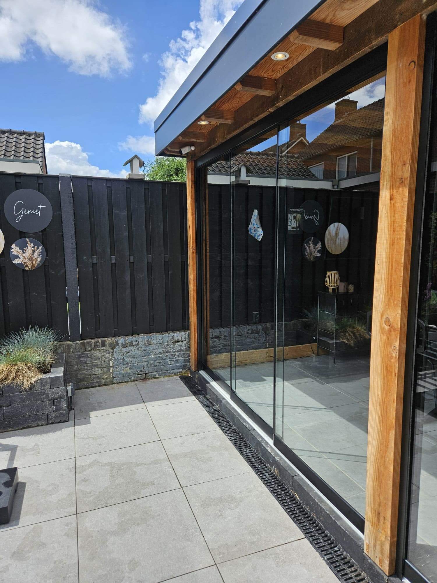 Wat een plaatje is het geworden! 😍 Deze gezellige Douglas overkapping hebben wij voorzien van hoogwaardige glazen schuifwanden. Voor het aluminium railsysteem is gekozen voor de trending kleur zwart RAL 9005, wat prachtig combineert met het warme Douglas hout en een luxe uitstraling geeft. 🖤🛠️