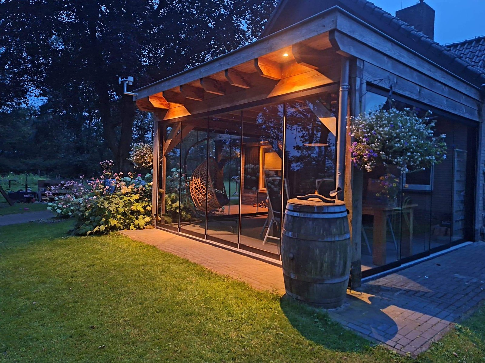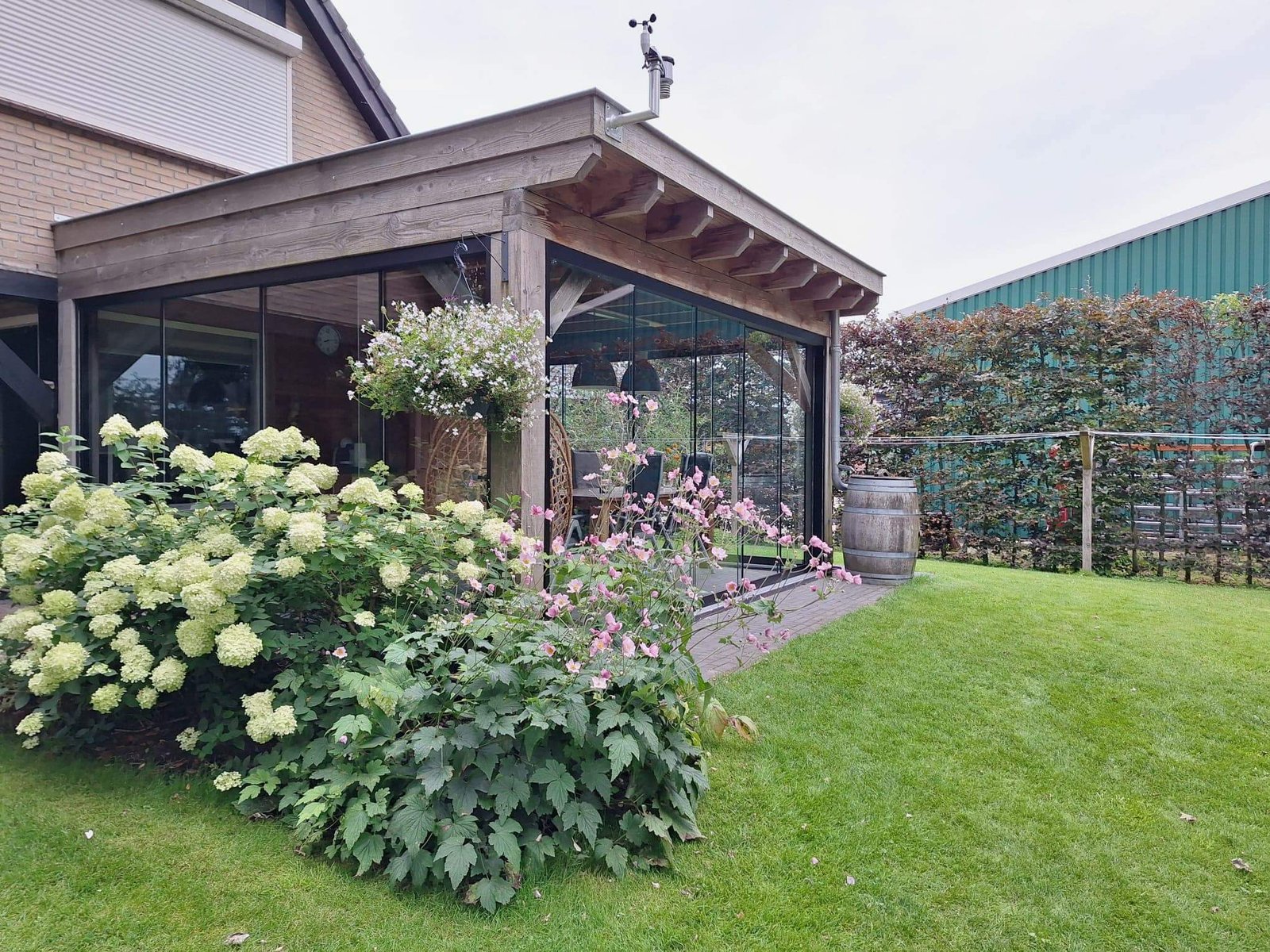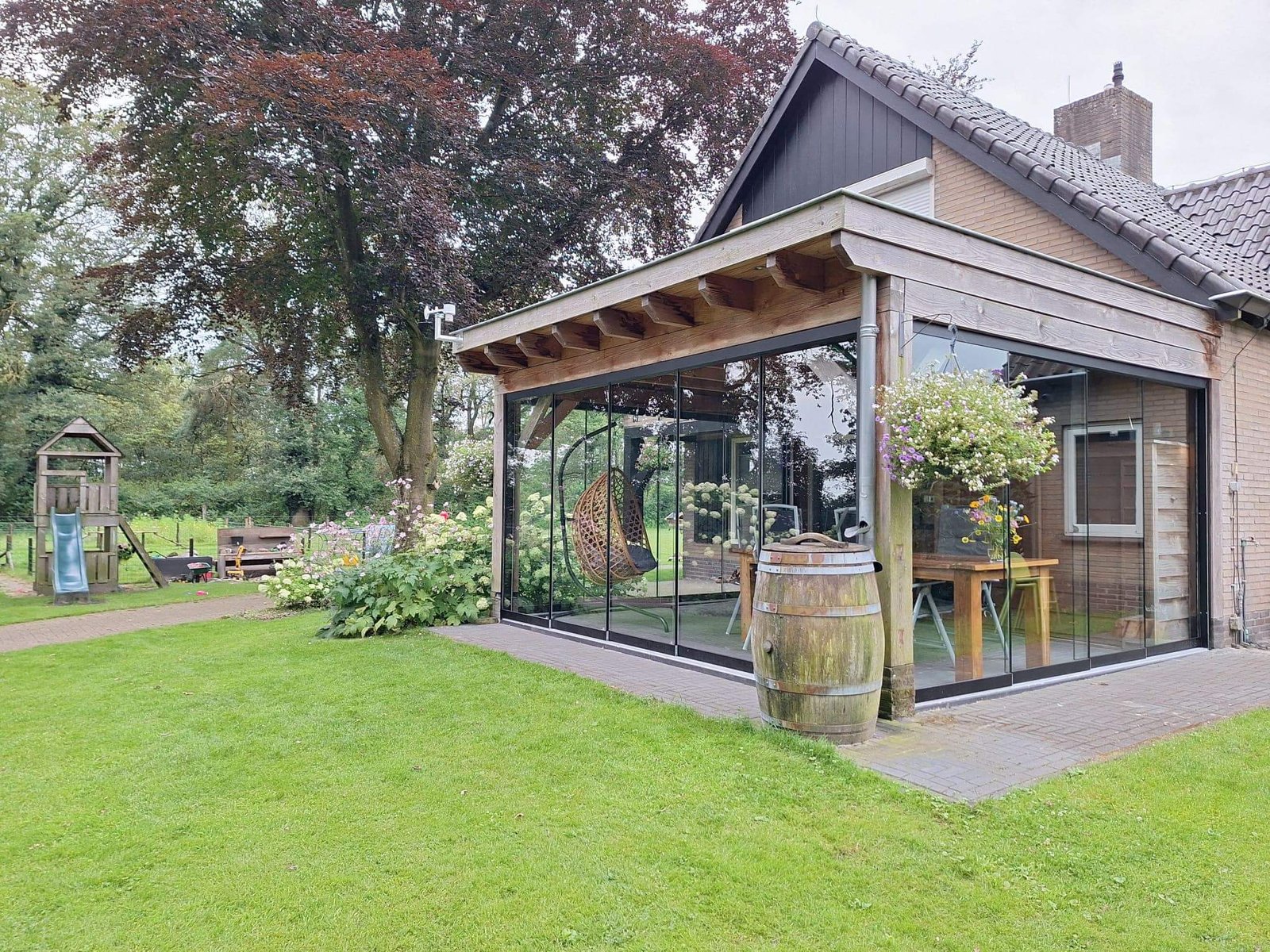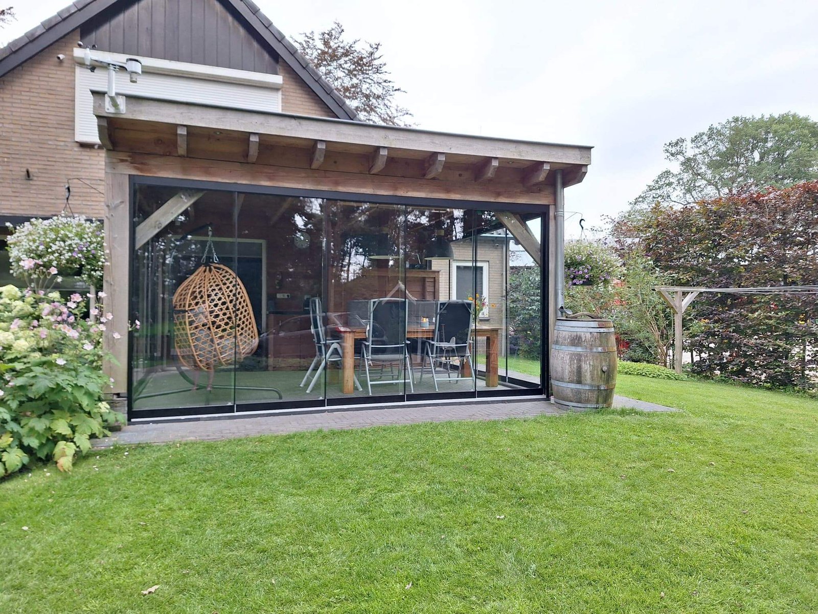 Deze prachtige Douglas overkapping van 5×4 meter hebben wij volledig rondom voorzien van onze hoogwaardige glazen schuifwanden.
